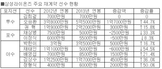 이로써 삼성은 1,2군 전체 재계약 대상 선수(FA 포함) 78명 가운데 73명(93.6%)이 계약을 마쳤다.