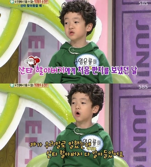 [OSEN=박정선 인턴기자] 개그맨 염경환의 아들 은률 군이 산타 할아버지에 대한 엉뚱한 칭찬으로 웃음을 자아냈다.