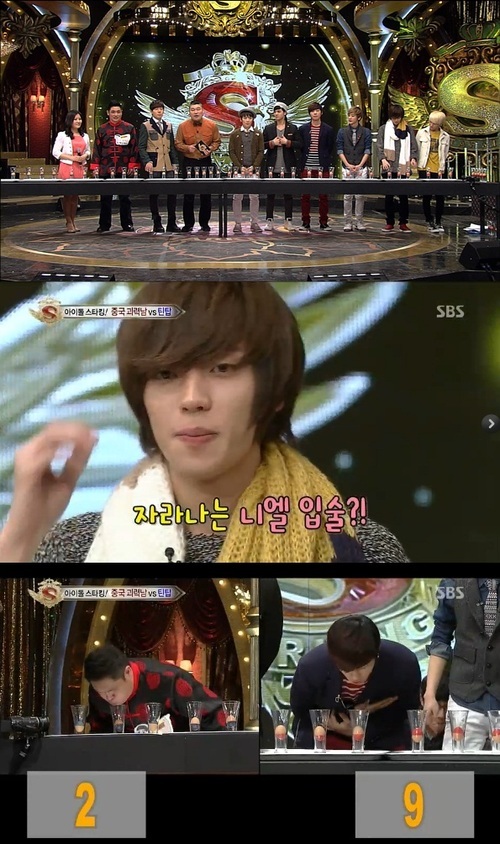 틴탑은 12일 방송된 SBS 예능프로그램 '놀라운 대회 스타킹'에서 중국에서 온 괴력남 띵 짜오하이에 맞서 입김으로 계란 뒤집기 대결을 펼쳤다.