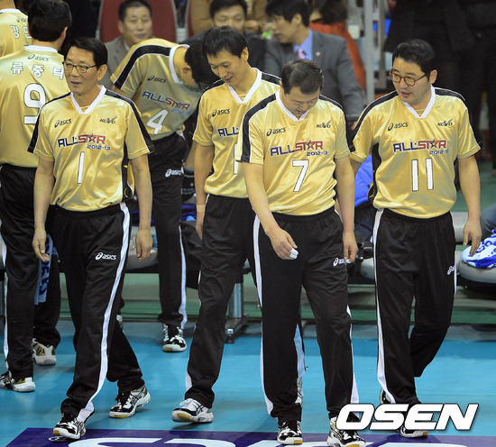 12일 오후 서울 잠실학생체육관에서 열린 NH농협 2012-2013 V리그 올스타전 올드보이즈와 영걸스의 경기, 올드보이즈 선수들이 작전타임 후 코트로 향하고 있다.