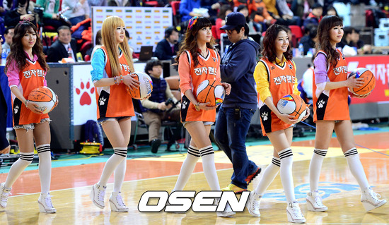 13일 오후 인천 삼산월드체육관에서 열린 'KB 국민카드 2012-2013 프로농구' 인천 전자랜드와 부산 KT의 경기에 앞서 걸그룹 비비드 걸이 시투를 하기위해 입장하고 있다.