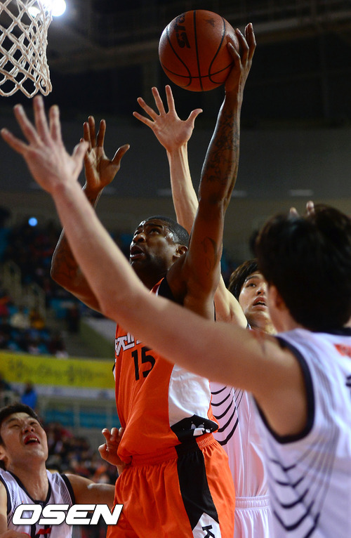 13일 오후 인천 삼산월드체육관에서 열린 'KB 국민카드 2012-2013 프로농구' 인천 전자랜드와 부산 KT의 경기, 1쿼터 전자랜드 포웰이 KT 장재석의 수비를 뚫고 점프슛을 시도하고 있다.