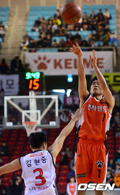 13일 오후 인천 삼산월드체육관에서 열린 'KB 국민카드 2012-2013 프로농구' 인천 전자랜드와 부산 KT의 경기, 1쿼터 전자랜드 정병국이 점프슛을 시도하고 있다.