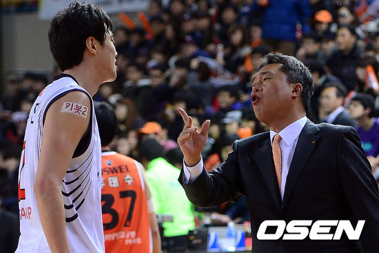 13일 오후 인천 삼산월드체육관에서 열린 'KB 국민카드 2012-2013 프로농구' 인천 전자랜드와 부산 KT의 경기, 1쿼터 KT 전창진 감독이 송영진에게 작전지시를 하고 있다.
