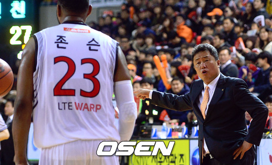 13일 오후 인천 삼산월드체육관에서 열린 'KB 국민카드 2012-2013 프로농구' 인천 전자랜드와 부산 KT의 경기, 2쿼터 KT 전창진 감독이 존슨에게 작전지시를 하고 있다.