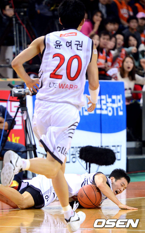 13일 오후 인천 삼산월드체육관에서 열린 'KB 국민카드 2012-2013 프로농구' 인천 전자랜드와 부산 KT의 경기, 2쿼터 KT 김명진이 루즈볼을 잡으려다 넘어지고 있다.