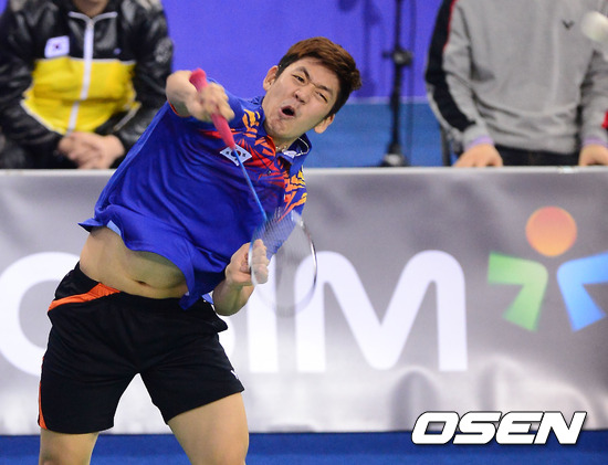 13일 오후 서울 방이동 올림픽공원 SK올림픽핸드볼경기장에서 열린 '2013 빅터 코리아오픈 배드민턴 슈퍼시리즈 프리미어' 결승전에서 이용대가 공격을 하고 있다.