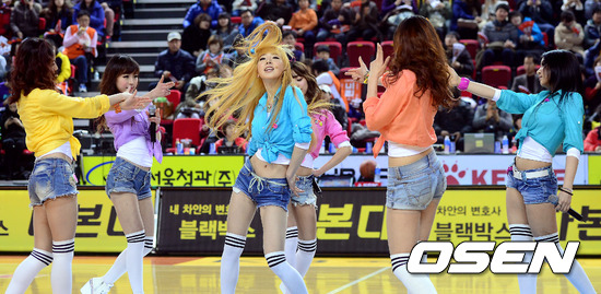 13일 오후 인천 삼산월드체육관에서 열린 'KB 국민카드 2012-2013 프로농구' 인천 전자랜드와 부산 KT의 경기, 비비드걸이 멋진 공연을 선보이고 있다.