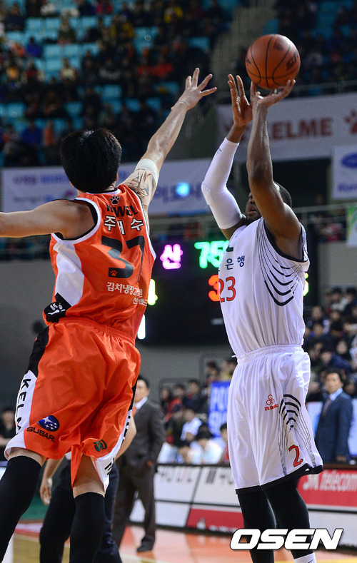 13일 오후 인천 삼산월드체육관에서 열린 'KB 국민카드 2012-2013 프로농구' 인천 전자랜드와 부산 KT의 경기, 3쿼터 KT 존슨이 전자랜드 주태수를 앞에두고 3점슛을 시도하고 있다.