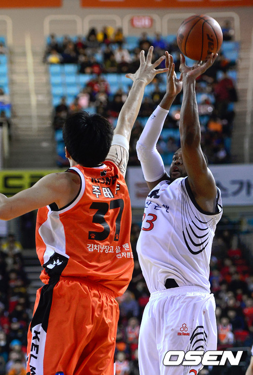 13일 오후 인천 삼산월드체육관에서 열린 'KB 국민카드 2012-2013 프로농구' 인천 전자랜드와 부산 KT의 경기, 4쿼터 KT 존슨이 전자랜드 주태수를 앞에두고 점프슛을 시도하고 있다.
