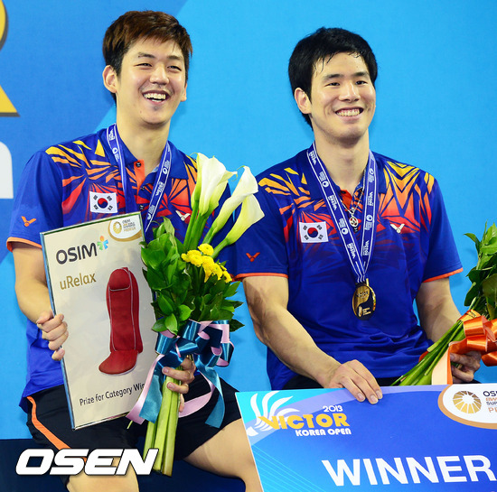 13일 오후 서울 방이동 올림픽공원 SK올림픽핸드볼경기장에서 열린 '2013 빅터 코리아오픈 배드민턴 슈퍼시리즈 프리미어' 결승전에서 이용대(25, 삼성전기)-고성현(26, 김천시청, 세계랭킹 10위) 조가 세계랭킹 1위를 꺾고 2013 빅터 코리아오픈 배드민턴 슈퍼시리즈프리미어 정상에 섰다.