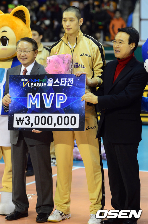 12일 오후 서울 잠실학생체육관에서 열린 NH농협 2012-2013 V리그 올스타전 시상식에서 MVP를 차지한 문성민이 기념촬영을 하고 있다.