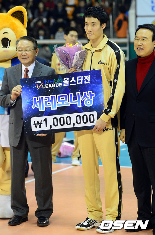 12일 오후 서울 잠실학생체육관에서 열린 NH농협 2012-2013 V리그 올스타전 시상식에서 세레모니상을 받은 최홍석이 기념촬영을 하고 있다.