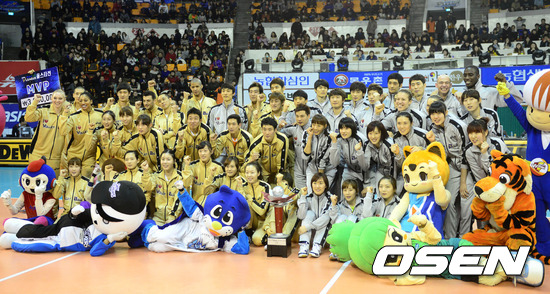 12일 오후 서울 잠실학생체육관에서 열린 NH농협 2012-2013 V리그 올스타전 종료 후 선수들이 기념촬영을 하고 있다.