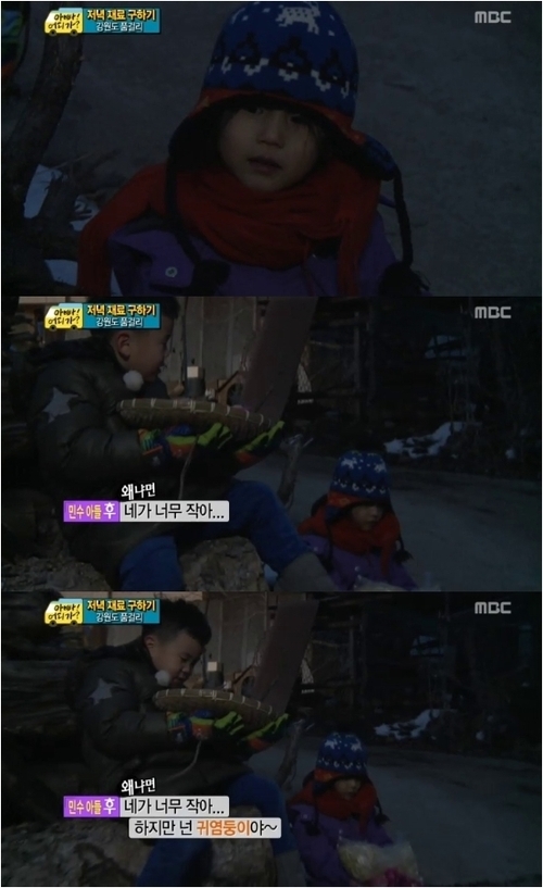 김민국, 윤후, 송지아는 13일 방송된 MBC 예능 프로그램 ‘일밤-아빠 어디가’에서 저녁식사 재료를 얻기 위해 마을을 돌아다녔다. 이 과정에서 윤후는 잠시 쉬는 사이 송지아에게 자리를 양보했다.