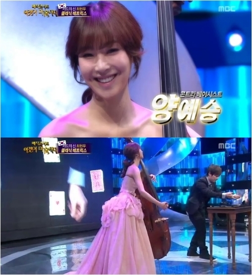 양예승은 13일 방송된 MBC 예능 프로그램 ‘일밤-매직콘서트 이것이 마술이다’에서 최현우를 돕기 위해 콘트라베이스를 연주하는 연주자로 등장했다.
