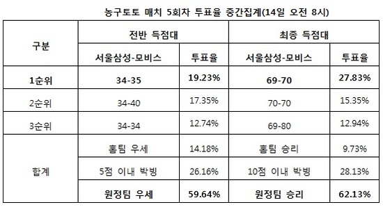 삼성의 승리를 예상한 참가자는 9.73%로 집계됐고, 양 팀 10점 이내 박빙 승부를 예상한 참가자는 28.13%로 나타났다. 전반전 역시 모비스의 우세(59.64%)예상이 1순위로 집계됐고, 5점 이내 박빙(26.16%)예상과 삼성 리드(14.18%)가 뒤를 이었다. 전반 득점대에서는 삼성 34점 이하, 모비스 35점대(19.23%)예상이 최다 집계됐고, 최종득점대에서는 69점 이하-70점대 모비스 승리(27.83%)예상이 가장 높게 나타났다.