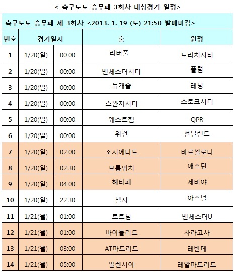[축구토토] 국민체육진흥공단(www.kspo.or.kr)이 발행하는 체육진흥투표권 수탁사업자인 스포츠토토(www.sportstoto.co.kr)는 오는 20일부터 이틀간 벌어지는 잉글랜드 프리미어리그(EPL) 8경기와 스페인 프리메라리가 6경기 등 총 14경기를 대상으로 한 축구토토 승무패 3회차 게임을 발행한다고 밝혔다.