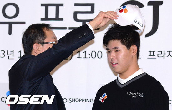 14일 오전 서울 플라자호텔에서 진행된 김시우 프로 CJ후원 조인식에서 CJ정길근 홍보실장이 김시우에게 모자를 씌어주고 있다.