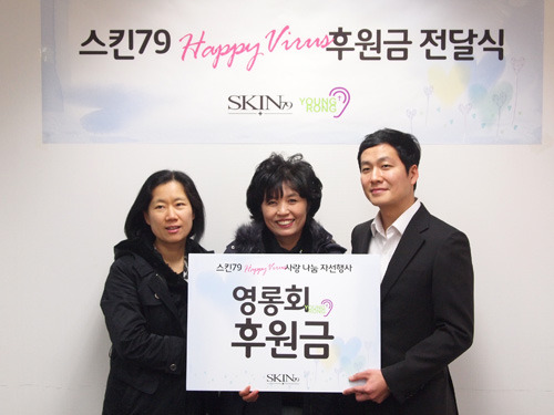 12월 서울 삼성 코엑스에서 ‘해피 바이러스(Happy Virus)’를 콘셉츠로 한 다양한 프로모션을 진행한 스킨79는 현장에서 1000원 이상 기부 시 1만 5,000원 상당의 스킨79 제품을 증정. 모금된 기부금 전액은 영롱회에 후원하는 ‘천 원의 행복’이라는 뜻 깊은 행사를 가졌었다.