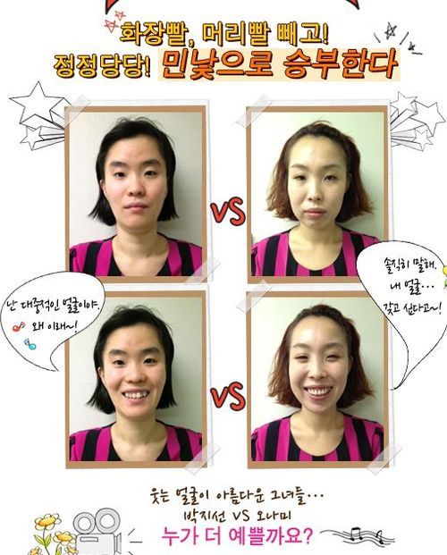 박지선과 오나미의 외모 대결 설문조사에는 ‘화장빨, 머리빨 빼고! 정정당당! 민낯으로 승부한다’라는 문구와 함께 두 사람의 무표정한 얼굴의 사진과 환하게 미소 짓는 사진이 함께 공개됐다. 이들은 같은 옷, 헤어스타일, 표정으로 카메라를 응시하고 있어 눈길을 끈다.