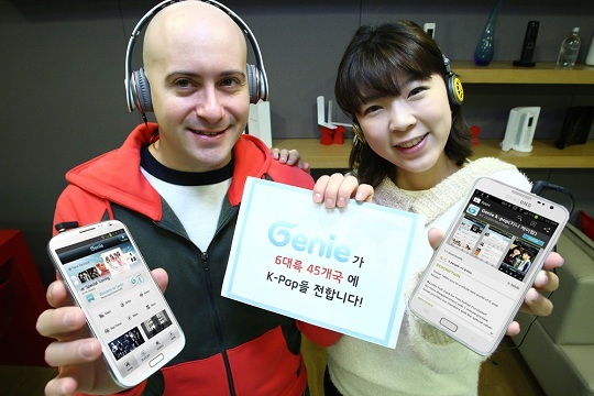 K-pop이 스마트폰 앱을 통해 미국, 프랑스, 인도 등 6대륙 45개국에 서비스된다. KT는 스마트폰 전용 디지털 음악 콘텐츠 앱 ‘Genie(지니)’의 글로벌 서비스인 ‘Genie K-pop’을 미국, 프랑스, 인도 등 전세계 6대륙 45개국에서 출시했다고 15일 밝혔다. 국내 스마트폰 음악 전용 앱이 글로벌 서비스로 출시된 것은 이번이 처음이다.