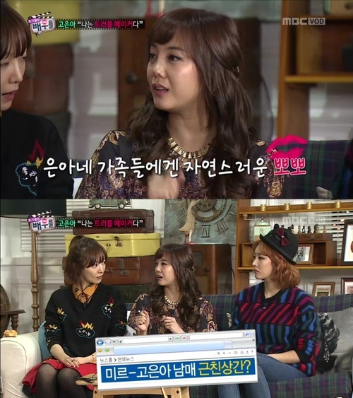 고은아는 “대중이 나를 미르의 누나로 보는 게 아니라 여자로 본다”면서 “우리 가족이 애정표현이 남달라서 남동생에게 뽀뽀를 했는데 다음날 근친상간이라는 말까지 나왔다”고 속상한 감정을 드러냈다. 앞서 고은아는 한 케이블방송에서 동생 미르에게 뽀뽀를 한 모습이 방송된 후 논란이 일었다.