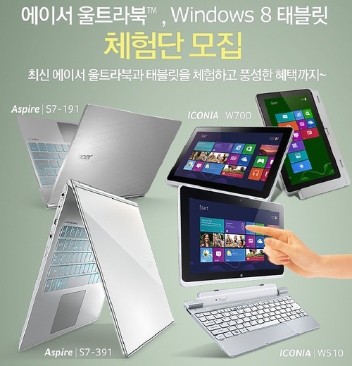 PC제조기업 에이서가 자사의 울트라북 및 태블릿 4종 제품의 체험단을 모집한다고 15일 밝혔다. 체험단에게는 제품 무상증정, 할인권 증정 등 푸짐한 혜택이 제공된다.
