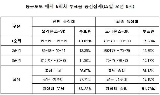 국민체육진흥공단이 발행하는 체육진흥투표권 수탁사업자인 스포츠토토의 공식 온라인 발매 사이트 베트맨(www.betman.co.kr)은 오는 16일 오후 7시 고양체육관에서 열리는 오리온스-SK의 경기를 대상으로 하는 농구토토 매치 6회차 게임 투표율 중간 집계한 결과, 전체 참가자의 51.73%가 리그 선두 SK의 승리를 예상하고 있는 것으로 나타났다고 밝혔다.
