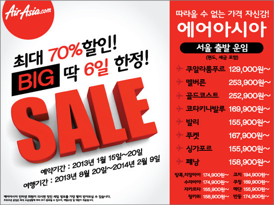 빅세일 특가항공권은 1월15일부터 20일까지 에어아시아 웹사이트에서 예약이 가능하며, 해당 여행기간은 8월 20일부터 2014년 2월 9일까지다.
