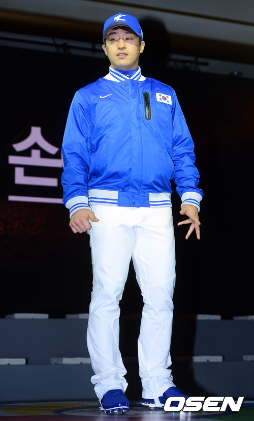 15일 오후 서울 역삼동 르네상스 서울호텔에서 열린 제3회 월드베이스볼 클래식(WBC) 국가대표팀 출정식 및 유니폼 발표회에서 손아섭이 새 유니폼을 선보이고 있다.
