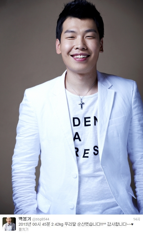 백봉기는 15일 오전 자신의 트위터에 “2013년 00시 45분 2.42kg 우리 딸 순산했습니다! 감사합니다~”라는 글을 게재하며 득녀 소식을 알렸다.