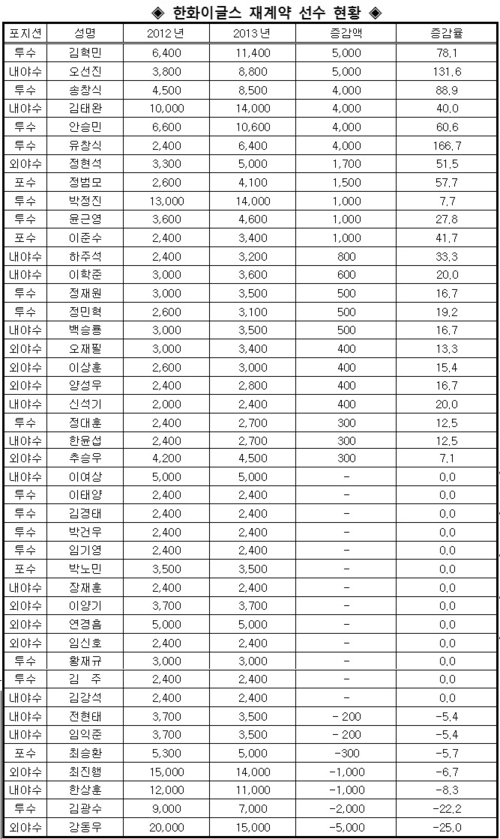 5000만원 이상 크게 오른 선수는 김혁민과 오선진 둘 뿐이지만, 한화는 1000만원 이상 인상된 선수가 11명이 되는 등 총 23명의 연봉이 올랐다. 투수 최고참 박정진이 1억3000만원에서 7.7% 상승된 1억4000만원에 계약하며 팀 내 투수 최고 연봉자가 됐다.