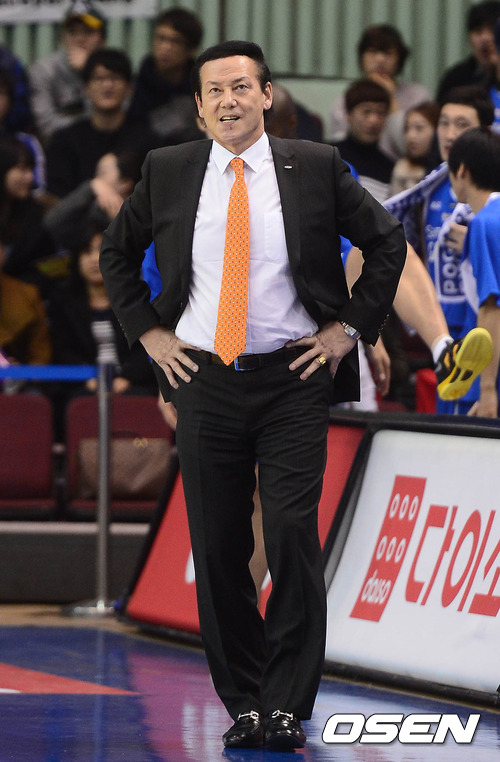 15일 오후 서울 잠실 실내체육관에서 열린 '2012-2013 KB국민카드 프로농구' 서울 삼성과 울산 모비스의 경기 1쿼터 종료 후 김동광 감독이 전광판을 바라보고 있다.