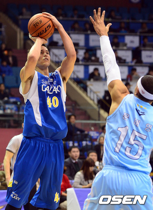 15일 오후 서울 잠실 실내체육관에서 열린 '2012-2013 KB국민카드 프로농구' 서울 삼성과 울산 모비스의 경기 2쿼터 이동준이 문태영을 앞에두고 슛을 시도하고 있다.