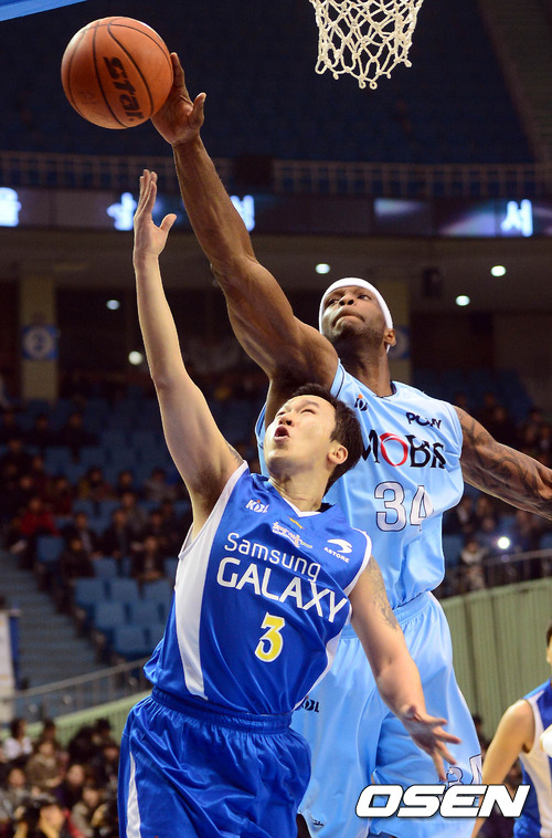 15일 오후 서울 잠실 실내체육관에서 열린 '2012-2013 KB국민카드 프로농구' 서울 삼성과 울산 모비스의 경기 2쿼터 위더스가 김승현의 슛을 막아내고 있다.