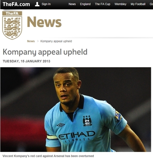 FA는 16일(이하 한국시간) 홈페이지를 통해 "콤파니가 아스날과 경기서 받은 레드카드에 대해 항소한 것을 검토했다"면서 "그 결과 콤파니에 내려졌던 레드카드에 대해 잘못됐다는 판단을 내렸고 취소하게 됐다. 따라서 콤파니에게 내려졌던 3경기 출장도 무효"라고 밝혔다.