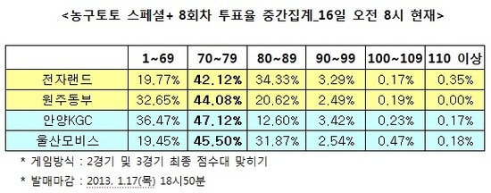 투표율을 살펴보면, 1경기 전자랜드-원주동부전의 경우 각각 70~79점대가 42.12%, 44.08%로 최다를 차지했다.