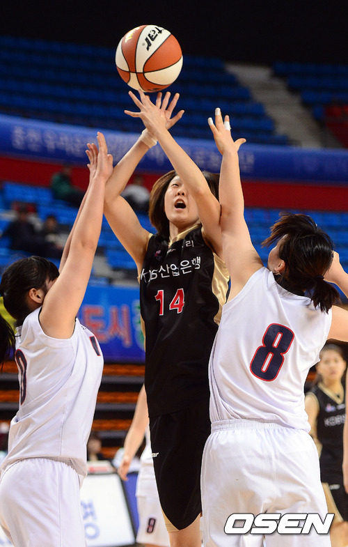 14일 경산실내체육관에서 열린 'KDB금융그룹 2013 여자농구 챌린지컵' KDB생명과 전주비전대의 경기, 2쿼터 KDB생명 원진아가 전주비전대 수비를 뚫고 점프슛을 시도하고 있다.