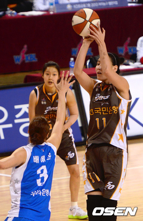 16일 오후 경산실내체육관에서 열린 'KDB금융그룹 2013 여자농구 챌린지컵' 우리은행과 KB스타즈의 경기, 1쿼터 KB 이경희가 우리은행 배혜윤을 앞에두고 점프슛을 시도하고 있다.