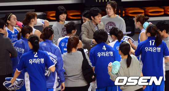 16일 오후 경산실내체육관에서 열린 'KDB금융그룹 2013 여자농구 챌린지컵' 우리은행과 KB스타즈의 경기, 1쿼터 우리은행 위성우 감독이 선수들에게 작전지시를 하고 있다.