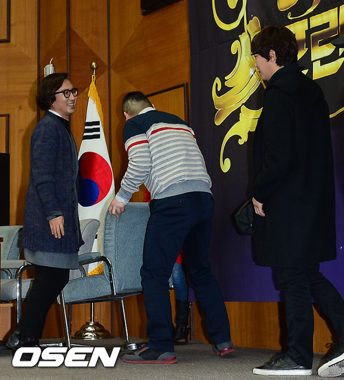 16일 오전 KBS신관 국제회의실에서 열린 KBS 새 예능 '달빛프린스' 기자간담회에서 포토타임을 위해 강호동이 의자를 치우고 있다.