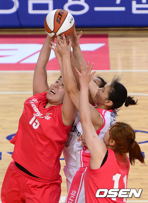 16일 오후 경산실내체육관에서 열린 'KDB금융그룹 2013 여자농구 챌린지컵' 하나외환과 광주대의 경기, 2쿼터 하나외환 선수들과 광주대 선수들이 리바운드 다툼을 벌이고 있다.