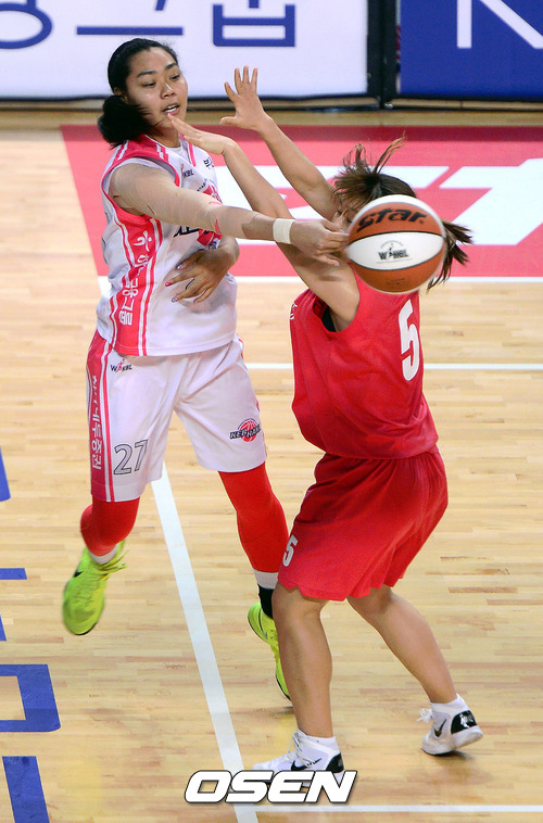 16일 오후 경산실내체육관에서 열린 'KDB금융그룹 2013 여자농구 챌린지컵' 하나외환과 광주대의 경기, 2쿼터 하나외환 김한빛이 몸을날려 공을 살려내고 있다.