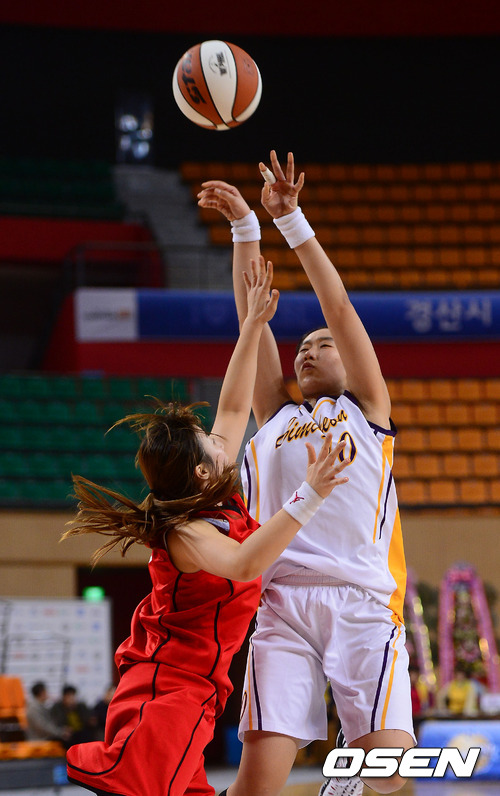16일 오후 경산실내체육관에서 열린 'KDB금융그룹 2013 여자농구 챌린지컵' 김천시청과 부산시체육회의 경기, 2쿼터 김천시청 김민경이 점프슛을 시도하고 있다.