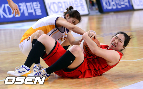 16일 오후 경산실내체육관에서 열린 'KDB금융그룹 2013 여자농구 챌린지컵' 김천시청과 부산시체육회의 경기, 1쿼터 부산시체육회 장혜영과 김천시청 장민길이 루즈볼 다툼을 벌이고 있다.