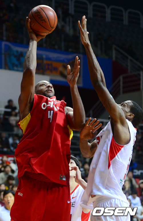 16일 오후 고양시 고양체육관에서 열린 '2012-2013 KB국민카드 프로농구' 고양 오리온스와 서울 SK의 경기 4쿼터 윌리엄스가 헤인즈를 앞에두고 슛을 시도하고 있다.