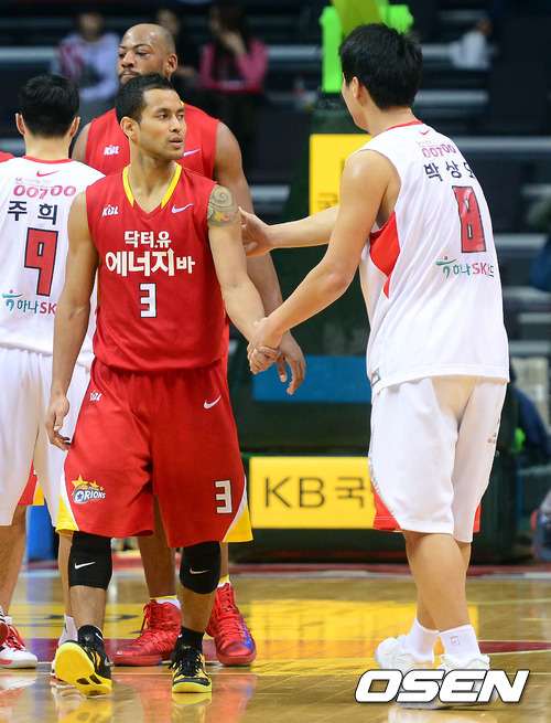 16일 오후 고양시 고양체육관에서 열린 '2012-2013 KB국민카드 프로농구' 고양 오리온스와 서울 SK의 경기 종료 직전 전태풍과 박상오가 인사를 나누고 있다.