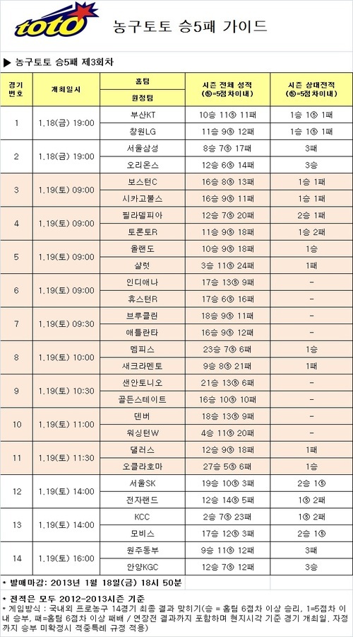 한편 서울SK-전자랜드(12경기) 전에서는 참가자들의 58.07%가 리그 선두 서울SK의 6점차 이상 승리를 예상했으며, KCC-모비스(13경기)전에서는 84.12%가 모비스가 KCC에 6점차 이상으로 승리할 것으로 전망했다. 한편 농구토토 승5패 3회차 게임은 8일 오후 6시 50분에 발매가 마감된다.