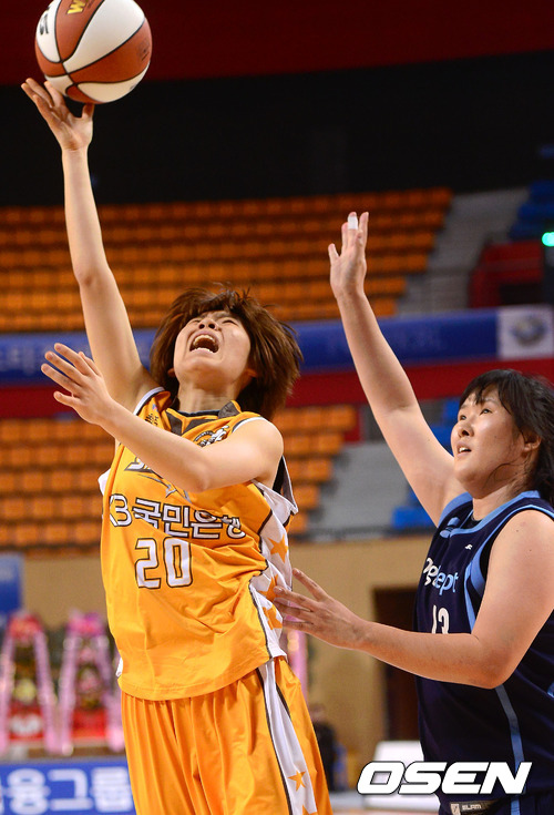 17일 오후 경산실내체육관에서 열린 'KDB금융그룹 2013 여자농구 챌린지컵' 준결승전 KB스타즈와 동아백화점의 경기, 1쿼터 KB 김민정이 수비를 뚫고 레이업슛을 시도하고 있다.